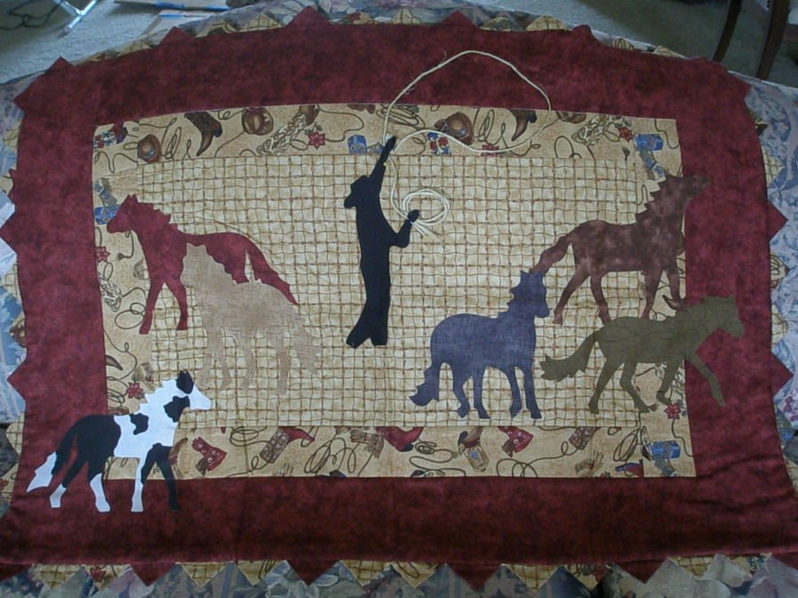 | Design Source - Description | This was my VERY FIRST quilt ever! My daughter wanted a horse themed birthday party, with ponies! This was before I knew anything about hand/fusible applique. YYIIKKEESS!! Where did the boots go?!?!? |