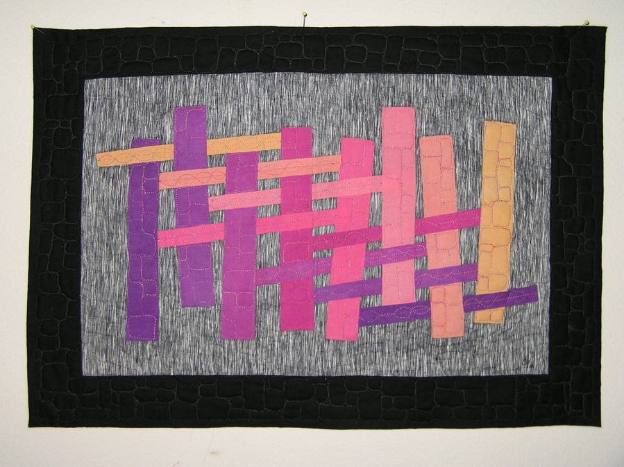 | Design Source - Description | This is a playful use of leftover strips of hand dyed fabrics. I was fiddling around when they struck me as a bunch of leaning monoliths, not unlike Stonehenge. |