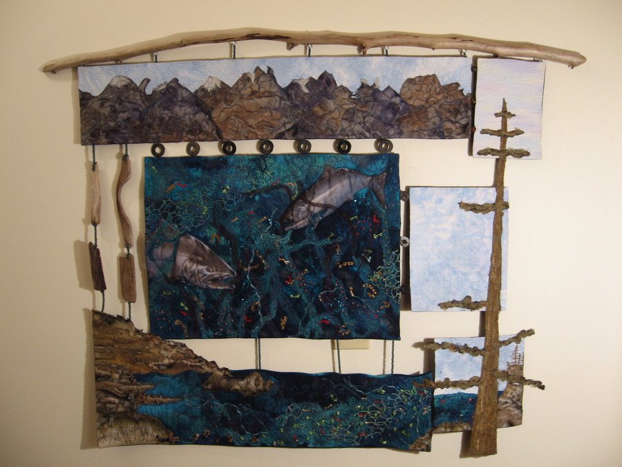 creativeark In the beginning - Salmon 1 - Quilt was made in late 2006 for the Pacific Salmon Foundation spring fund raiser auction in Victoria, BC, held in February of 2007. It sold for $300, and was donated back to the foundation to be re-sold at a later function. Designed and made by Alice, it includes photo transfer techniques, raw edge applique, couching and using many unusual materials for the joining, including the driftwood hanger.