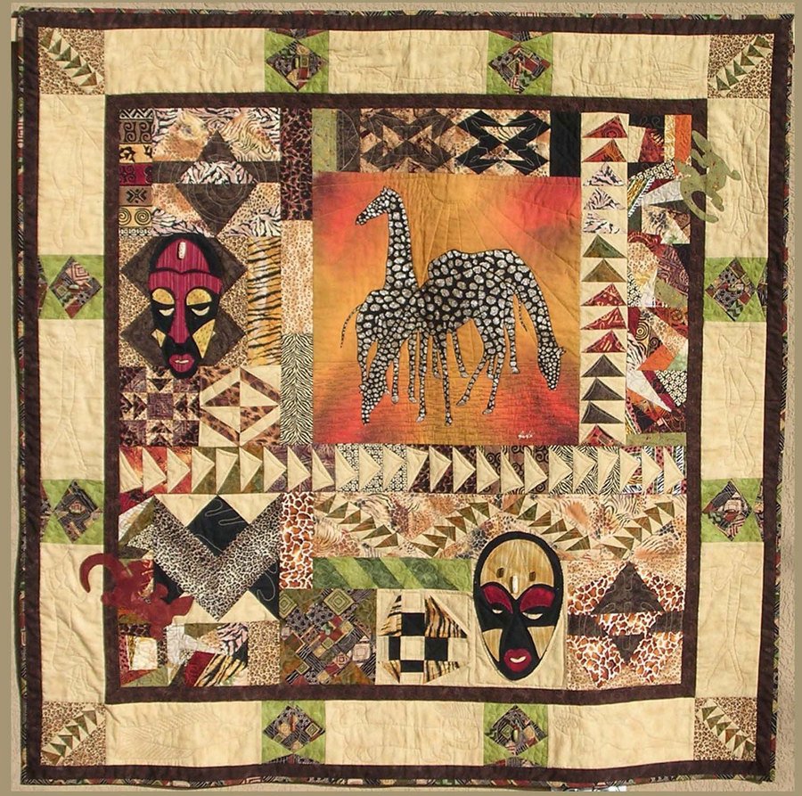 BeverlyJ Shannon's Serengeti - Designed in EQ5, I created blocks to surround a purchased batik panel. Most of the blocks are skewed or distorted. This was my first totally original design, and the first quilt I machine quilted myself.
