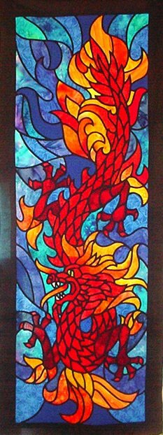 RGraham The Dragon - Quilt top only in this picture. Batiks were mostly used for the inset colors; solid black fabric for the "lead lines". Shown without the borders.
