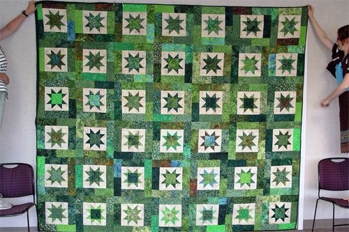 BionicLady2 Todd & Gina's Wedding Quilt - I lovingly just completed this queen sized quilt for my nephew Todd and Gina's wedding, July 28, 2007. They wanted something in green and tan. I collected green batiks and found the tan background. I had a wonderful time putting all the blocks together. It is based on the Lucky Stars pattern from Atkinson Designs.