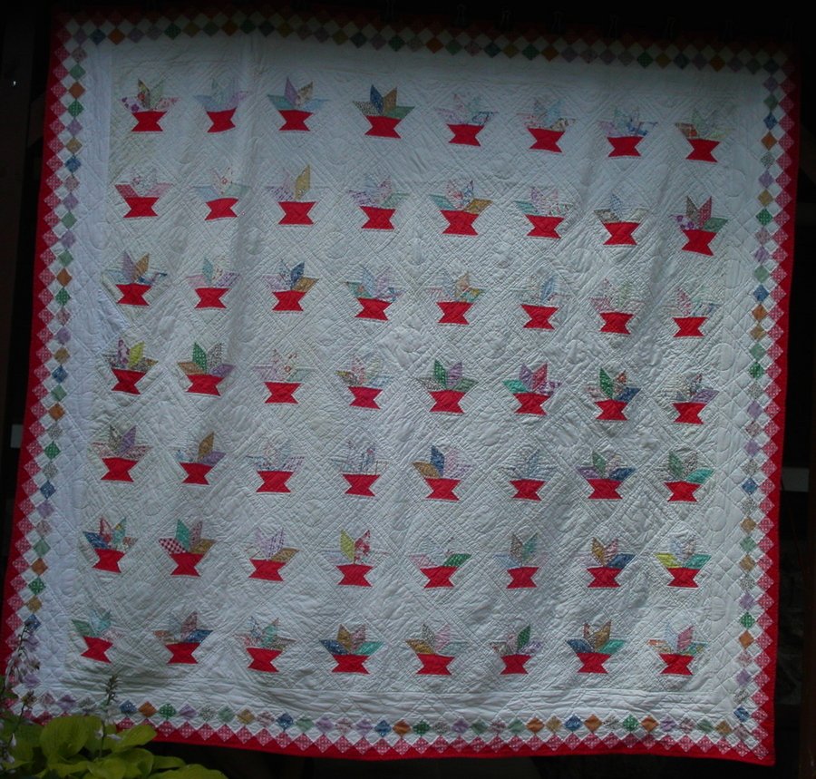 cactusbasket Amanda's Cactus Basket - My mother remembers this quilt on her parents bed in Oklahoma when she was child of 6, so we are estimating that my Great Grandmother Burris must have made it sometime the end of 1920's and the mid 1930's. This quilt moved around with the family from Oklahoma during the Depression and WWII. It has lived in 7 states and by the 2000's was stained, some of the diamonds were threadbare, it had rips and tears and my Grandmother had attempted to machine sew two colors of red bias boarder on it. (My Grandmother wasn't a sewer.) I removed the red boarder, the hand quilting on the boarder edges, appliqued over the worn and damaged diamonds and white blocks that were stained and or worn. None of the red basket material needed any repair. Thank God because I wasn't able to find the color any where. I hand quilted over the repairs and added a boarder using the 1930's fabrics that I had used in the repaing the diamonds. (See Pictures for before photos of the damaged blocks.) As I was finishing up this quilt , I was also signing up to be a member of the "Quilt Show". I needed to come up with a log-in-name, so used the quilt block as my log-in-name.
