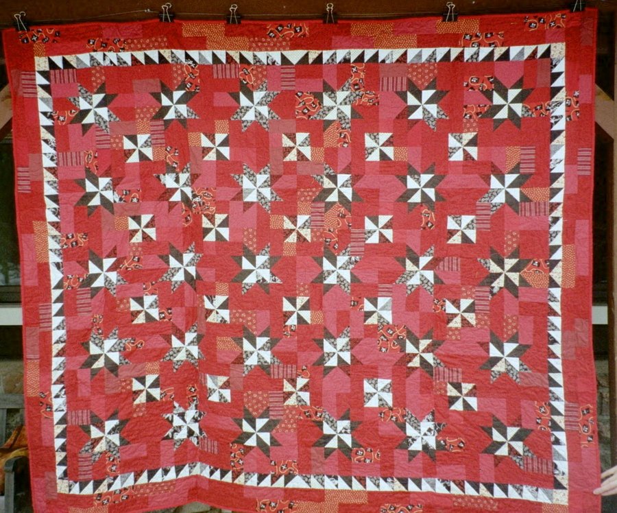 cactusbasket Scrappy Stars - This red, black and white pattern appealed to me because the high school, college and university my son had graduated from had combinations of these colors. This will be his graduation present next December when he graduates with his masters in Physics. My Favorite Quilt Shop in Green Bay, Wisconsin will train you and let you rent time on their Nolting long arm quilt machine. Since this quilt was larger than I'm use to I tried long arm quilting for the first time. It was an interesting expereince. I did get the entire quilt done in 5 hours time.