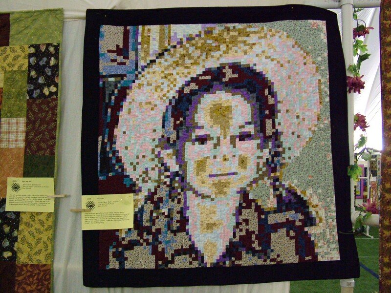 gfpdsecretary Love You to Pieces - Using a photograph of my 6 yo daughter (sporting a straw hat and braids), I used Tammie Bowser's software program to scan the image into my computer and break it down into 6,140 1" squares. I then selected fabric which I arranged according to value and fused them onto a plain grid and sewed it all together. It was the neatest process because any color of fabric will work as long as the value is correct. I was awarded 1st place in the Textiles category for a local competition and then went on to win Best of Show against all categories in the next round. I proudly display this work of art in my home (and I can't even draw a stick figure person)!