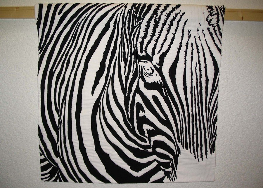 RhondaD Between the Linez - Simultaneous contrast quilt of the negative view of a zebra close-up, done in black fabric on white background. Pieces cut from the black fabric used to create my "The Eyez Have It" quilt were saved and used to create this quilt.