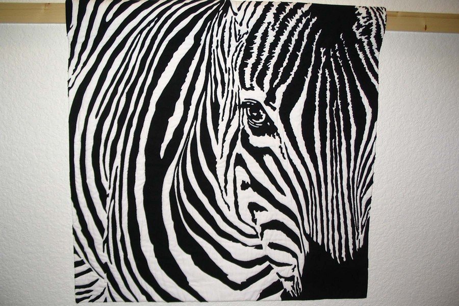| Design Source - Description | Simultaneous contrast quilt of a zebra close-up. Made with black fabric on a white background. The pieces cut from this quilt pattern were saved and used to make "Between the Linez" quilt. |