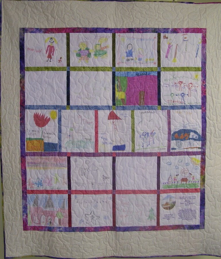 LStichweh Mrs. Alsip's Class - This quilt was made for my son's teacher. Each child drew a picture for the quilt and I put them together for her to remember them by.