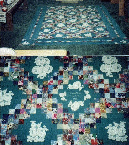 suesparker Tracey & Dawn's Wedding Quilt - This is a collective scrap quilt using fabrics left over from garments. I was making this my daughter but when I put the green in she decided she didn't want it. My son had just gotten engaged and my new dil to be loved it and the colors were perfect for their new home. She purchased some very expensive lace for the wedding that she couldn't use anywhere else. So..I appliqued sections of the lace on each blank block. It really dressed up the plain triple irish chain. It has their wedding date at the bottom embroidered on by machine. It is a heirloom treasure for them.