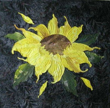 northwind Sunflower - Fabrics for sunflower and leaves were handpainted by the quiltmaker in Phil Beaver's class in 2002, and his petal and leaf motifs were used in the quiltmaker's own adaptation. Pieces were raw edged appliqued by machine and quilting in the background mimic the flora of the black on black fabric. My first sunflower was appliqued on a hobo bag finished in 2005.