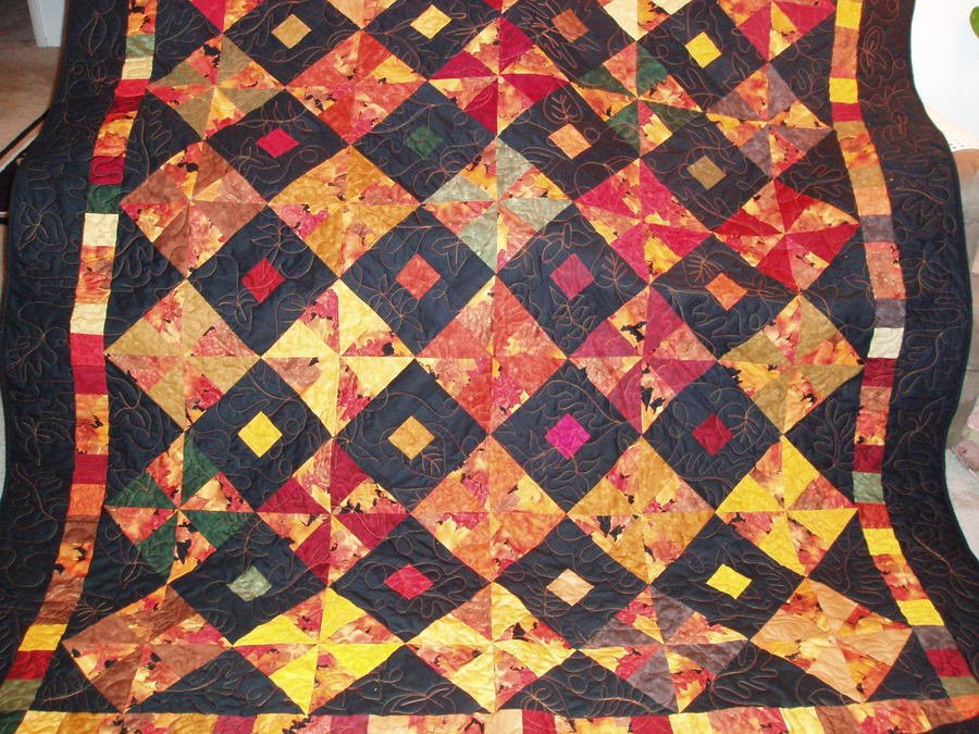 JMGAK Fall from the Heart - This quilt was made Thanksgiving weekend 2006 for a friend and his wife and was quilted on my long arm machine with freehand leaves. James had seen a quilit I made with these colors and loved it, so I used the left over pieces to make this quilt for him after he was hospitalized. It is treasured by his wife Jackie now.