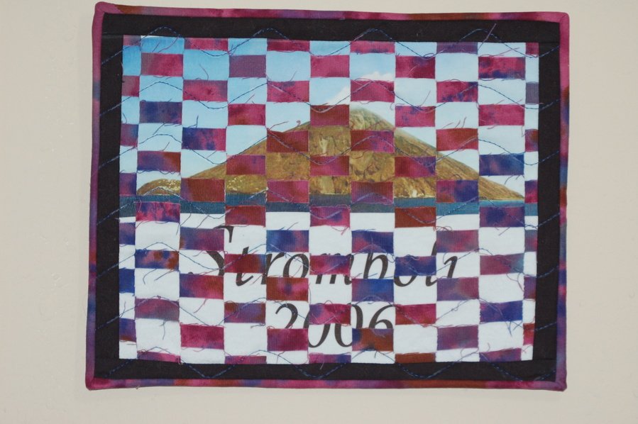 mccne Stromboli II - After travelling to Stromboli, Italy with 8 of my cousins to see our grandparents homeland, I made this quilt from a photo transfer of the Island. I cut the photo transfer in pieces then wove it back together. It was a gift to one of my cousins I travelled with.