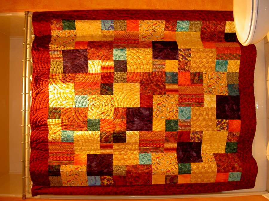 Design random squares arranged in 22 in blocks. This quilt is a shower curtain in my house. Sorry I couldn't figure out how to rotate picture. |