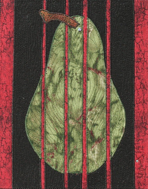 artquilt Caged - This art quilt portrays my idea that those with challenges may feel trapped. Families of patients with Alzheimer's disease must miss the interaction with their loved ones, and they, too, may feel caged.