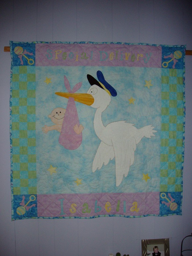 doctorjudy Special Delivery - I made this quilt to celebrate the birth of my granddaughter Isabella. Rather than have her actually use the quilt, mommy and daddy hung it on the wall.