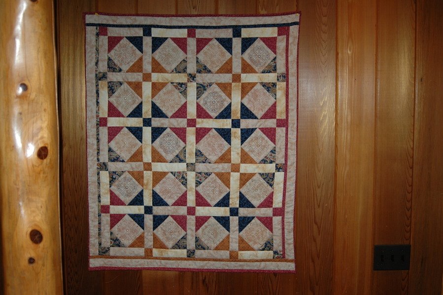 | Design Source - Description | My Grandaughter and I picked out the fabric for this quilt. It has machine embroidery in the center diamonds and some heat set bling. |