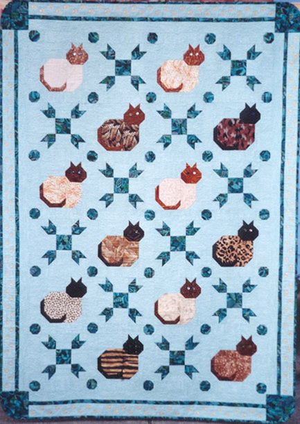 EditorAnne Gene's Cat House - I adapted the pattern by putting extra space around the cats and drafting foundation patterns for both the cat and the weathervane blocks. I also added cornerstones. I painted buttons for eyes, then stencilled paw prints around the border in gold paint. The quilt was supervised and tested at every stage by Aslan Brennan, my crabby (but lovable) little ginger cat. She even threw up on it a few times, to prove that it's a REAL cat quilt that can be washed. The quilt is called "Gene's Cat House" because my friend Gene's wife Maureen is afraid of cats, so the ones on this quilt are the only ones he'll ever be allowed to have in his house. :)