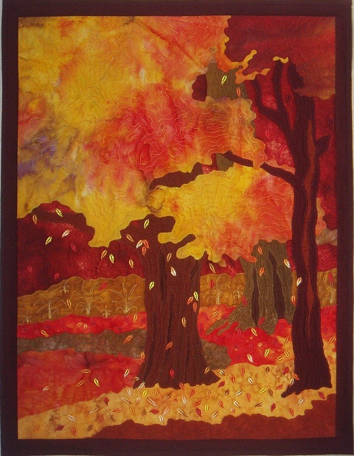 Scoopie Raw Heat - I made this quilt using all the tools I learned in the pilot class for the book "Color and Composition" by Katie Pasquini Masopust and Brett Barker. It is raw edge applique and in warm tones, hence the name, Raw Heat. It is on page 46 of the published book.