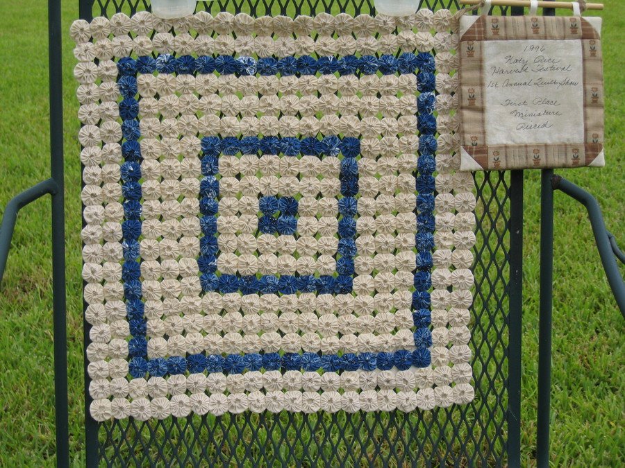 hereca622 Yo-Yo Lady - There are 400 Yo-Yos in this miniature quilt. I was a member of a ladies group that met once a week at a member's home. We worked on whatever project each of us had in progress, talked, laughed and ate. I became known as the YO-YO Lady while working on this project. Twelve years later, I am still good friends with some of the ladies and they still point out yo-yos to me.