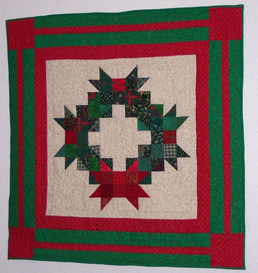 JafraLind Christmas Wreath Wall Hanging Quilt - Countryside Wreath made with Christmas colors of red and green.