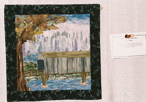 Jshulem Bridge over Troubled Water - This started with a panel piece with sky and water and trees. I added the remaining parts to create this bridge scene. It was my first landscape quilt and it was for a local guild Challenge with the theme of "Music," so I selected the song "Bridge over Troubled Water." It tied for 4th place.