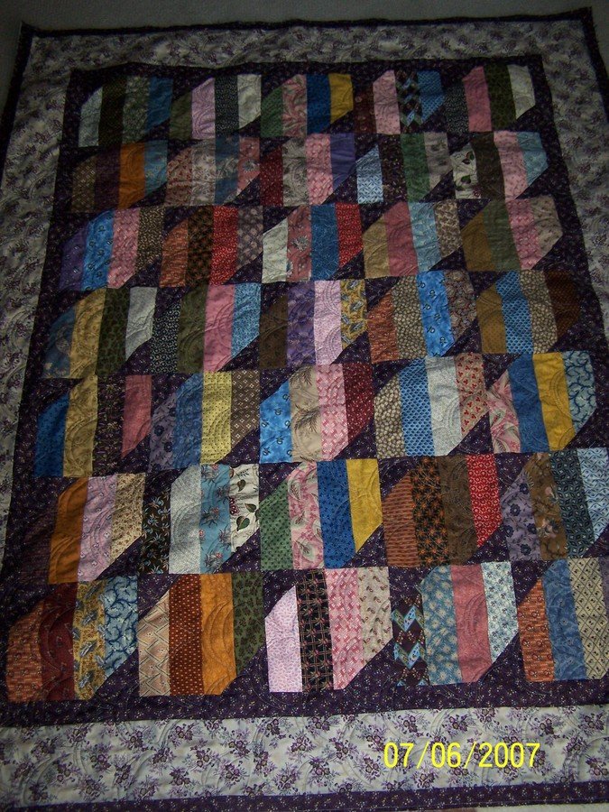 QUILTLOVERS SIMPLY STRIPPY - MY VERY BEST FRIEND MADE THE STRIP BLOCK THEN I ADDED THE CORNERS AND BORDERS. I WAS SO SURPRIZED AND TOUCHED THAT SHE WOULD TAKE THE TIME TO MAKE THESE BLOCKS FOR ME SO I HURRIED UP AND FINISHED THE QUILT. WE ARE USING IT IN OUR QUILT SHOP PRESENTLY AS A SAMPLE BUT I CAN HARDLY WAIT TO GET IT HOME