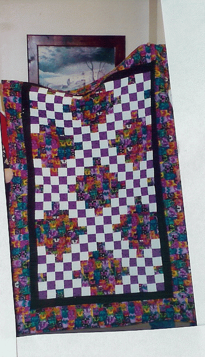 nanaquilts Marvin's Memory Quilt - This lap size quilt was made with Laurel Burch cat print fabric as a gift to my veterinarian who lovingly cared for my cat during his last years. It is machine pieced and quilted in a grid pattern.