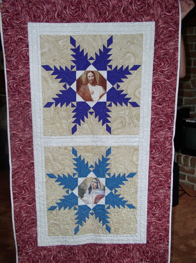 | Design Source - Description | Copyright-free images of the Sacred Heart of Jesus and the Immaculate Heart of Mary photo-transferred and pieced inside Feathered Star blocks. Made for my mother. |