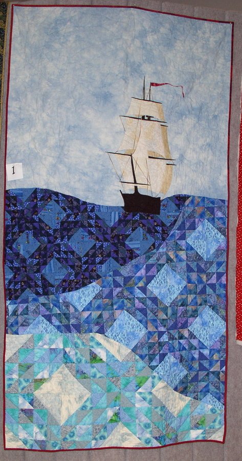Fangdoc Sailing the Ocean Waves - Made for a guild challenge to literally interpret a quilt block. Applique image adapted from a still of the H.M.S. Surprise from the movie "Master and Commander."