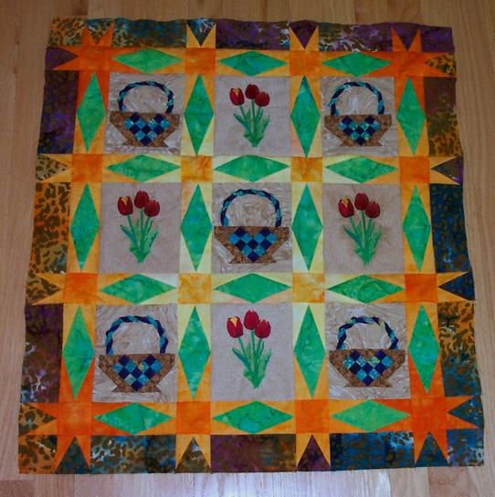 | Design Source - Description | Basket block from Sally Collin's book The Art of Machine Piecing. Machine embroidered tulips on fabric painted with 3 different shades of Lumiere. 5 shades of hand dyed yellow to orange in the stars. |