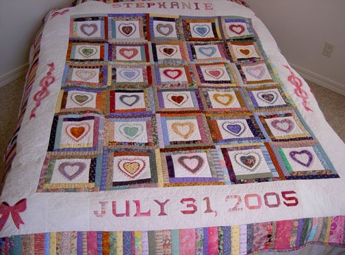 SueCinCA Old Fashioned Hearts - This quilt was made for our middle granddaughter and is pink, her favorite color. The hearts are appliqued with the embroidery module and then the log cabin strips were added to the center blocks. I included Stephanie's name and birthday, pieced into the top and bottom border.