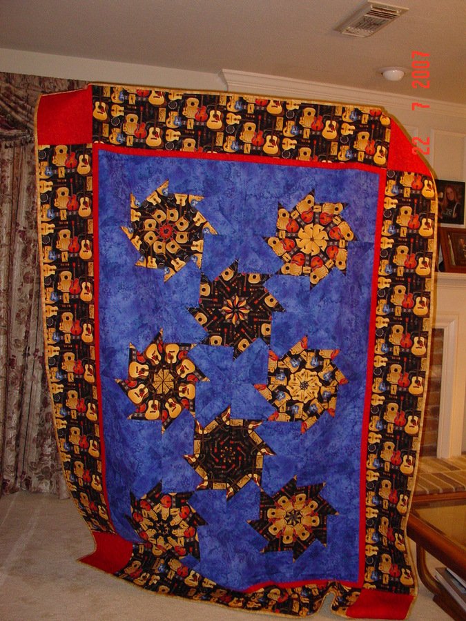 | Design Source - Description | Guitar print material used in the Stack 'n Whack blocks and the borders. Made for my husband, Stan, who loves to play the guitar. |