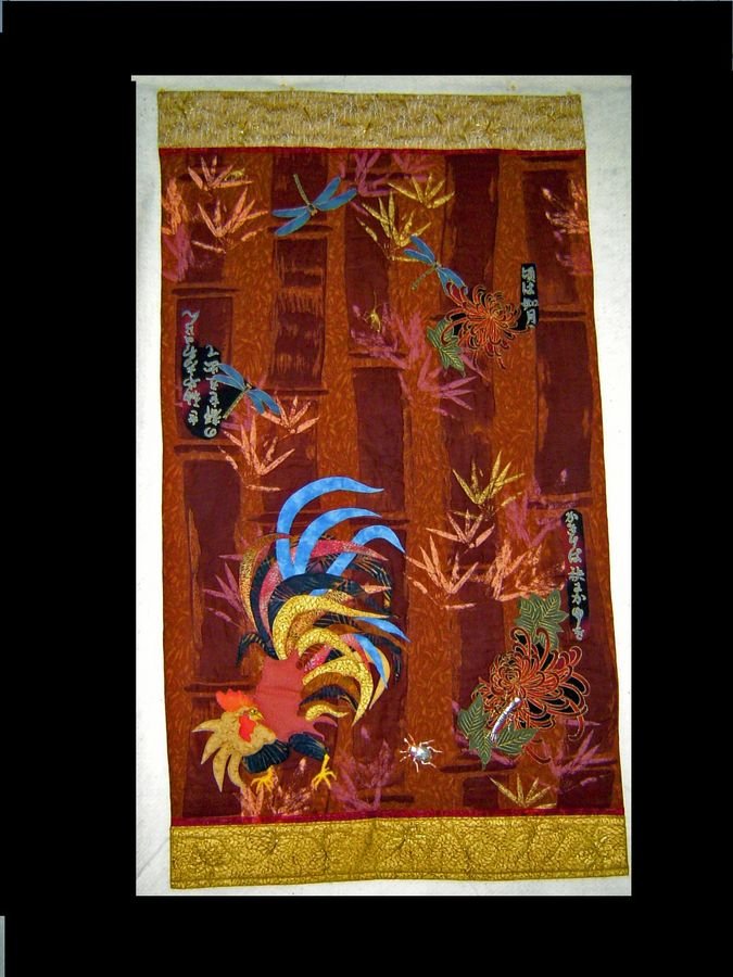 hapycrow What's For Dinner? - The design orginated from founding the oriental background fabric for the rooster I wanted to do in 3-D. Brown was a challenge for me.