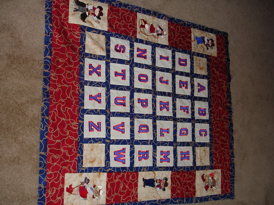 mlquilts Western ABC's - I used Athletic ABC's in my computer software for my embroidery machine and made the ABC's. I then used purchased designs for the cowboys and cowgirls and embroidered them. I placed the fabric and designs as desired and sewed them together to make a baby blanket or wall hanging.