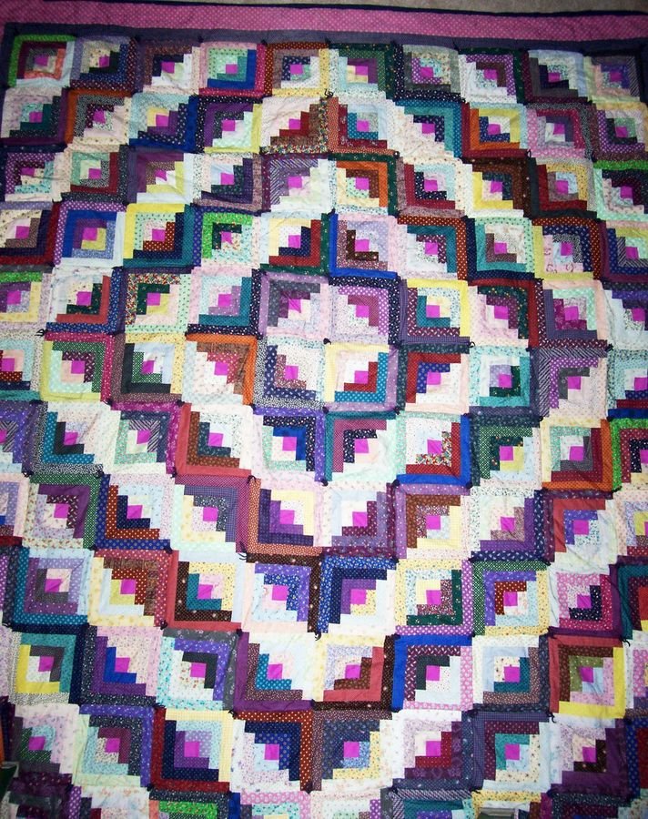 QuilterInaGarden My Crazy Log Cabin - I made a paper art piece using patterned and painted paper before I sewed this quilt. I gave it an 80's update and used a magenta center square for the center of the blocks where it is traditionally bright red. It was fun building a stash of floral calicos while I worked on this quilt. This was the first quilt I made. It was well used and loved and is now retired from daily use.