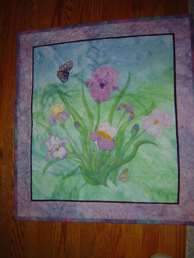 | Design Source - Description | I painted background, then colored flower leaves with crayons. Iris blooms and frog were painted with water colored pencils, and embroidered by hand. Butterfly is thread painted. |