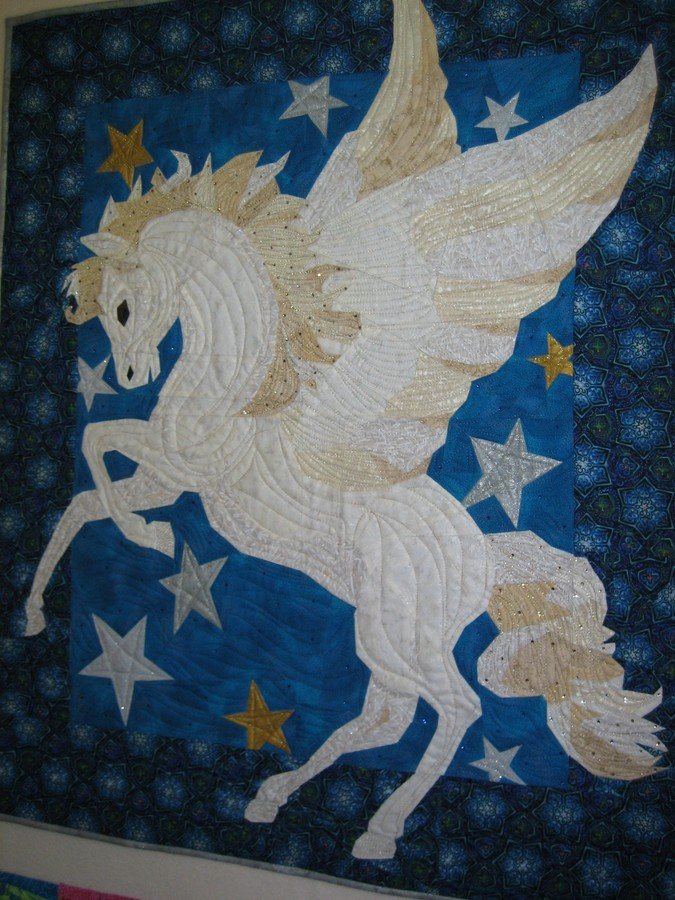 | Design Source - Description | I made Flight of Pegasus for my daughter Brooke. It is foundation pieced, quilted on a longarm with metallic threads. |