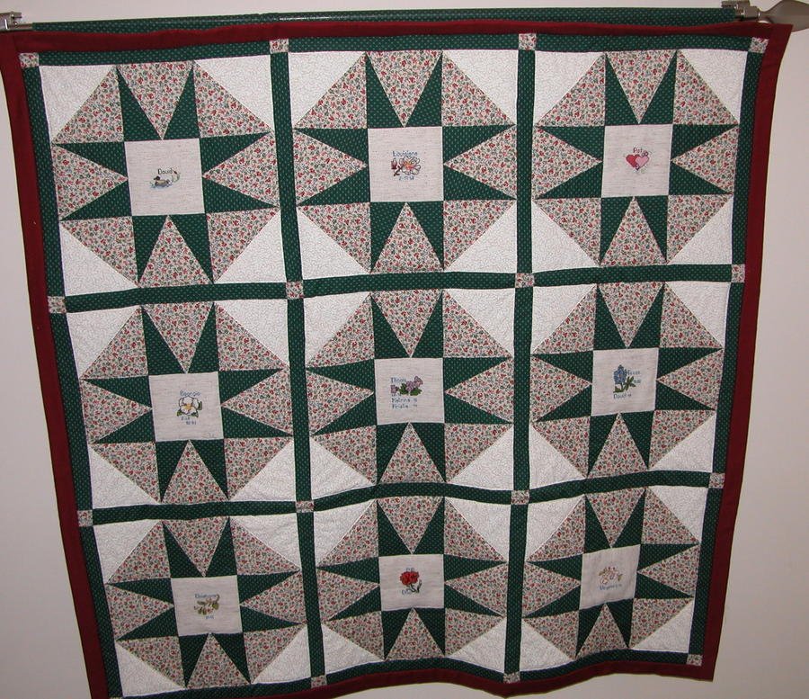 Bikerbabe3 Family Travels - I desinged this quilt and made it. It was my first quilt. I used cross stitched centers of the flowers for the states we have lived in. When a child was born in that state I put the name and BD in there also. First blocks were my husband and I's BD and state we were born in. Then the center upper block is our wedding date and state we were married in.