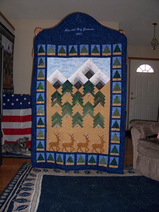 slawson Deer/Mountains - I was commissioned to make this quilt for a friend as a wedding gift for her other friend. It is a wall hanging. the top portion of the quilt is machined embroderied with the bride/groom names and wedding date.