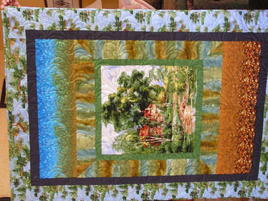 kwiltergirl Friendship House Quilt - Large center panel with multiple borders-feels peaceful, like sitting outside your home, on the shores of a quiet river, fishing pole in hand, eyes closed, memories arriving.