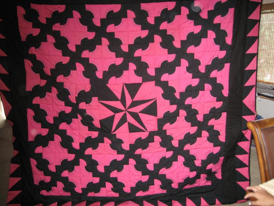 ellory the marriage quilt - my son is crazy about the Nor Cal star, in which he was born under. it is done in hot pink and black, it was his wedding colors. along with the star block, solomons puzzel, which is his name as well.