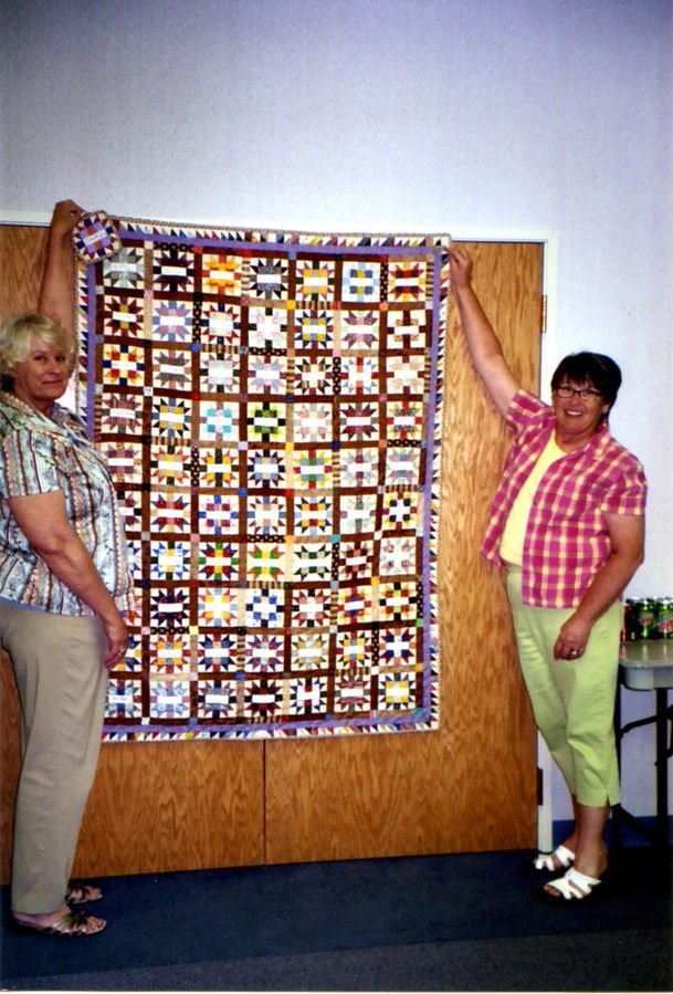 con8487 Remembrances - This was my 2006-07 project for my friend who retired in May. There are 70 blocks with signatures of coworkers, family, and sorority sisters. The little squares are finished 1 inch with the signature rectangle being 1 in. by 3 in. and each block finished at 4 inches. This was a great "scrappy" project. The receiver is on the left and the maker(me) is on the right.