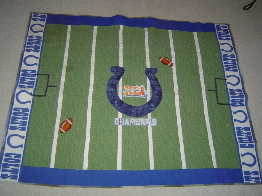 gailhall Indianapolis Colts Superbowl - I made this quilt to take to every Indianapolis Colts home game, while tailgating. It has kept me warm many times in January! This year I was able to add the Superbowl logo...since we won!!!
