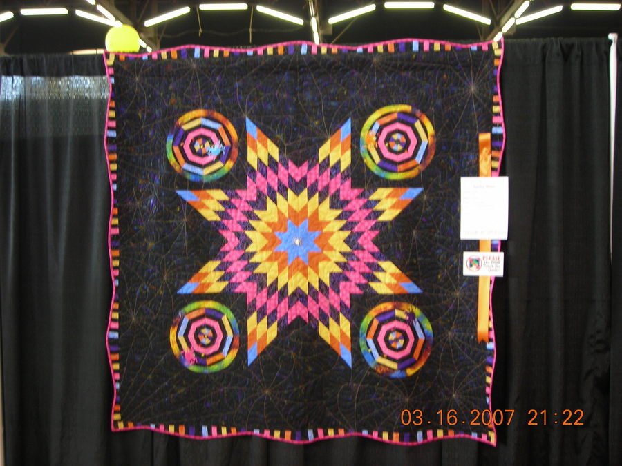 spidey SpideyWeen - I wanted this quilt to demonstrate the 'fun' in Halloween, ie. candy, candy and more candy. Each of the 4 pieced webs are home to 4 colorful embroidered fringed spiders and their 'treat', glass candy beads. The quilting was done with gold metallic thread and represent 'spider webs' all over the quilt. The background fabric was also used as a pattern for the paint on my motorcycle. (See the image on my profile)