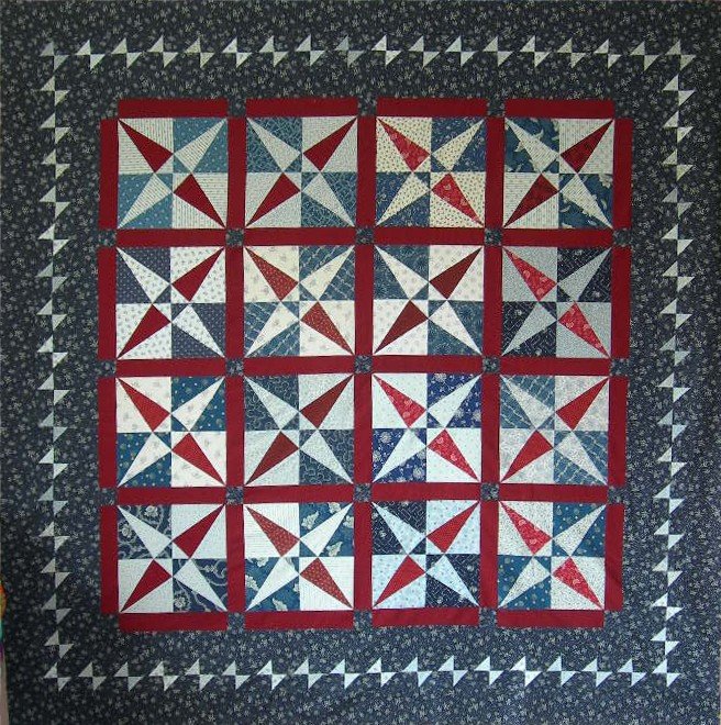 PeggyG Crossed Canoes - The Crossed Canoes is a traditional pattern dating back to the late 1800s. The angles of the canoes are very easy when paper pieced using freezer paper. The border is a butterfly border designed by friend Judy Madden of Ketchikan, Alaska. This quilt was pictured in the July/August edition of Quilter's Newsletter.