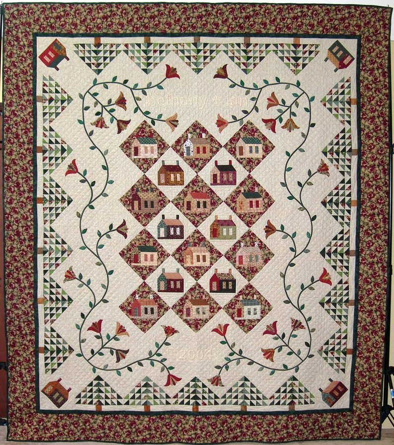 PeggyG Happiness to Ian and Bethany - I made this quilt for my son Ian and new wife Bethany. The design caught my eye because of the trees. They were both raised in the timber industry and secondly because of the houses. They are both architects. I modified the applique to accomodate trapunto of their names and the date of their marriage. It took me several years to complete. It is hand quilting using the Thimblelady method of handquilting. It was good training for my certification to teach the hand quilting method developed by Luixin Newman.