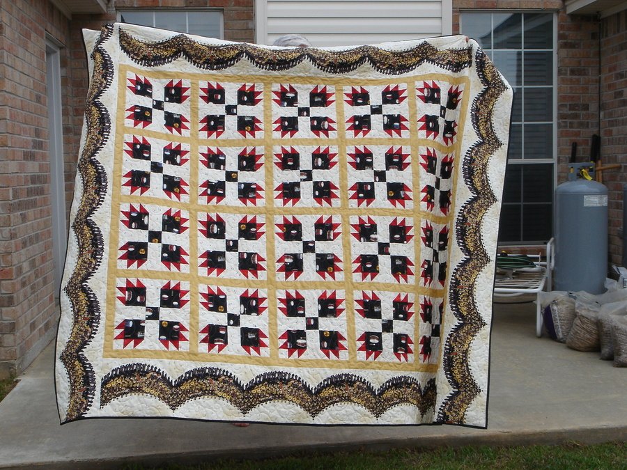 | Design Source - Description | When I saw this fabric advertised in a magazine I knew I had to make this quilt for my grandson. It was his first year with the marching band at his high school. They are the Golden Bears, hence the bear paw pattern! |