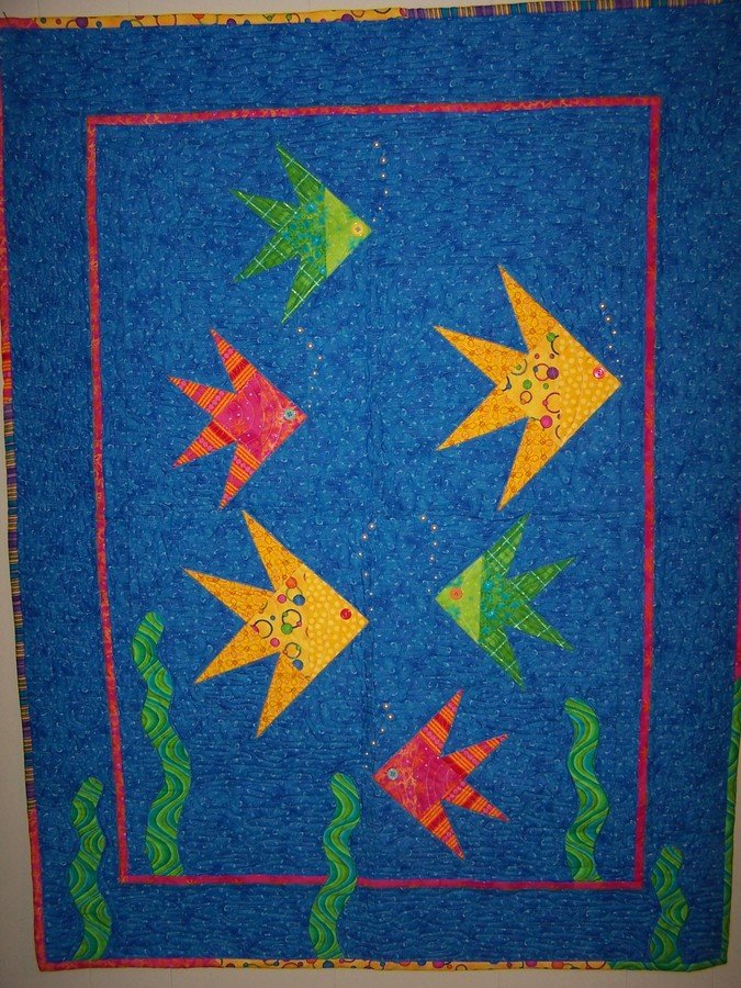 | Design Source - Description | Bright and colorful fish in clear blue water, graduated pearls on the quilt for water bubbles |