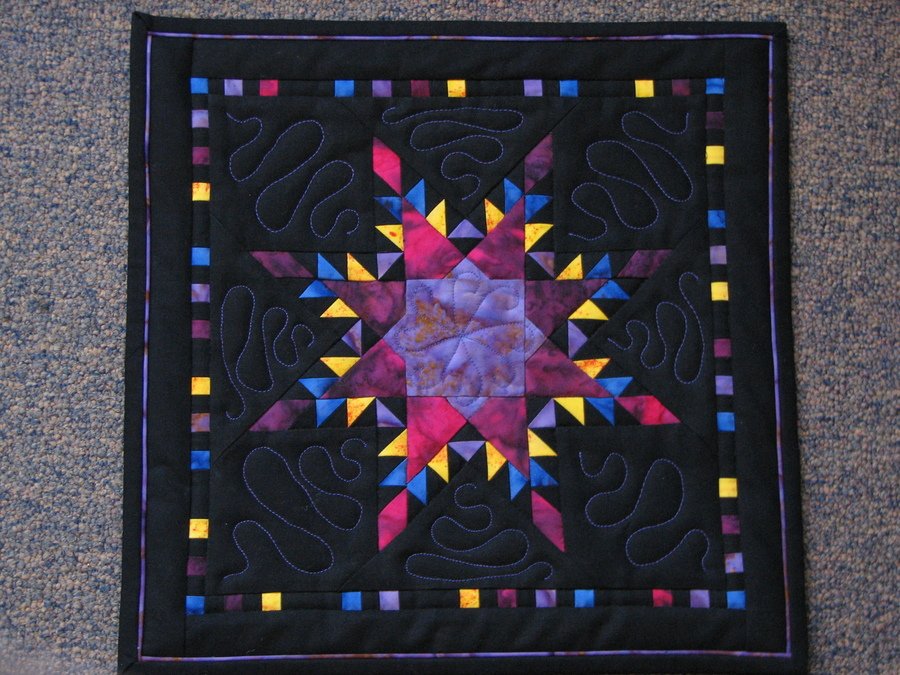 | Design Source - Description | I used commercial batiks purchased locally and a black solid background. I also followed the Perfectly Piped Bindings pushed in the Winter 2005 issue of American Quilter. |