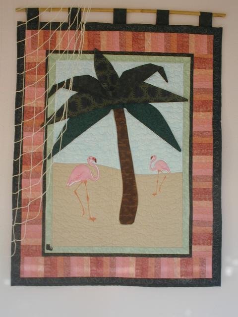 | Design Source - Description | A palm tree (three-dimensional leaves) with flamingos with beach and sea background, freehand quilted with BSR in metallic thread. |